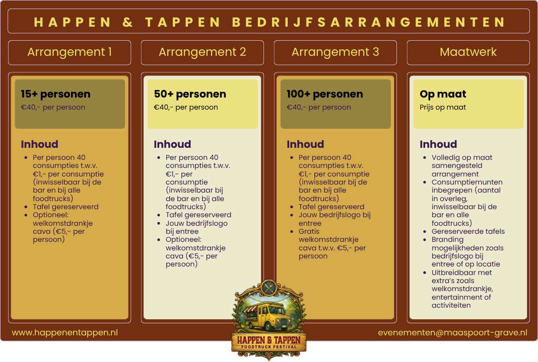 Samen met collega’s of relaties genieten van een compleet verzorgd foodtruckfestival? Kies een van onze arrangementen en wij regelen de rest. Neem contact met ons op voor meer informatie of om direct een arrangement te reserveren.